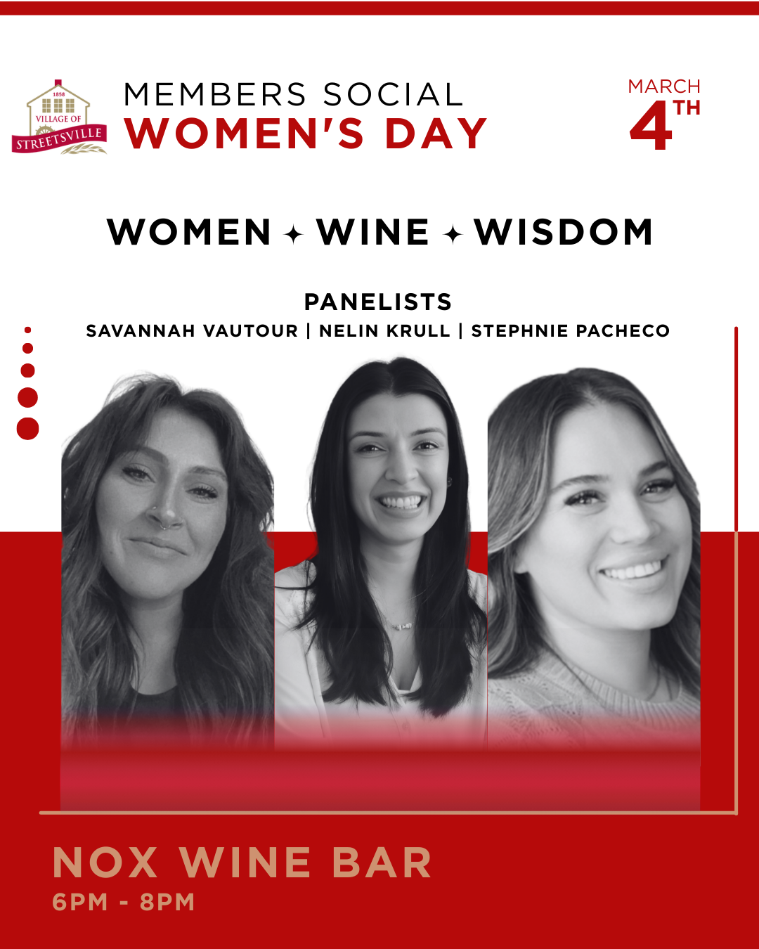 We’re inviting female business owners and staff to join us on Wednesday, March 4th from 6:00pm – 8:00pm at Nox Wine Bar for an inspiring evening featuring networking, a curated wine tasting, and a panel discussion with female leaders from our Streetsville business community.